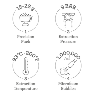 An opulent, creamy and caramel colored espresso starts with low pressure pre-infusions, followed by a high pressure (9 bar) extraction process delivered via our 15 bar Italian pump.